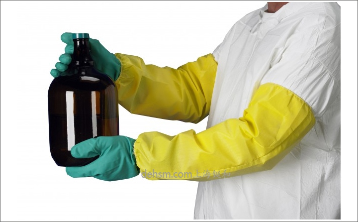 防化袖套采用亮黃色高密度聚乙烯膜,熱合膠帶封邊,整個袖長45厘米,可以有效化學(xué)品傷害。