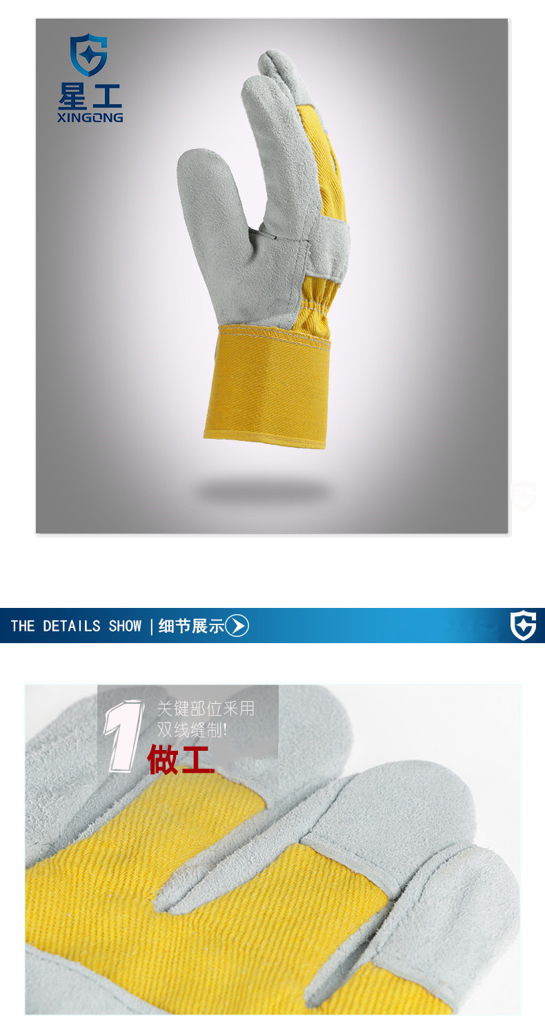 星工XGS-P1焊工手套做工精細,重要部位采用雙線縫制,手指間做了加固處理,耐磨不易開線。